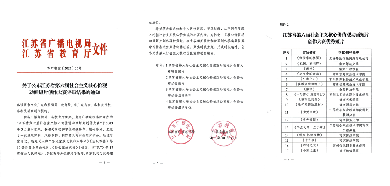 江苏省第六届社会主义核心价值观动画短片创作大赛经组织申报、线上线下两轮评审,从328部作品中评出精品短片10部,优秀短片17部。《引水上山》作品以大力推进引太湖水上山的惠民工程为创作背景,经过师生团队前期确定主题、调研和收集资料,制定创作计划,中期动画制作,后期调整审核,历时两个月按时制作完成。其独特的作品立意和创意设计,赢得了评委会的认可。