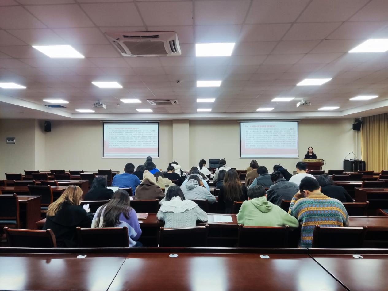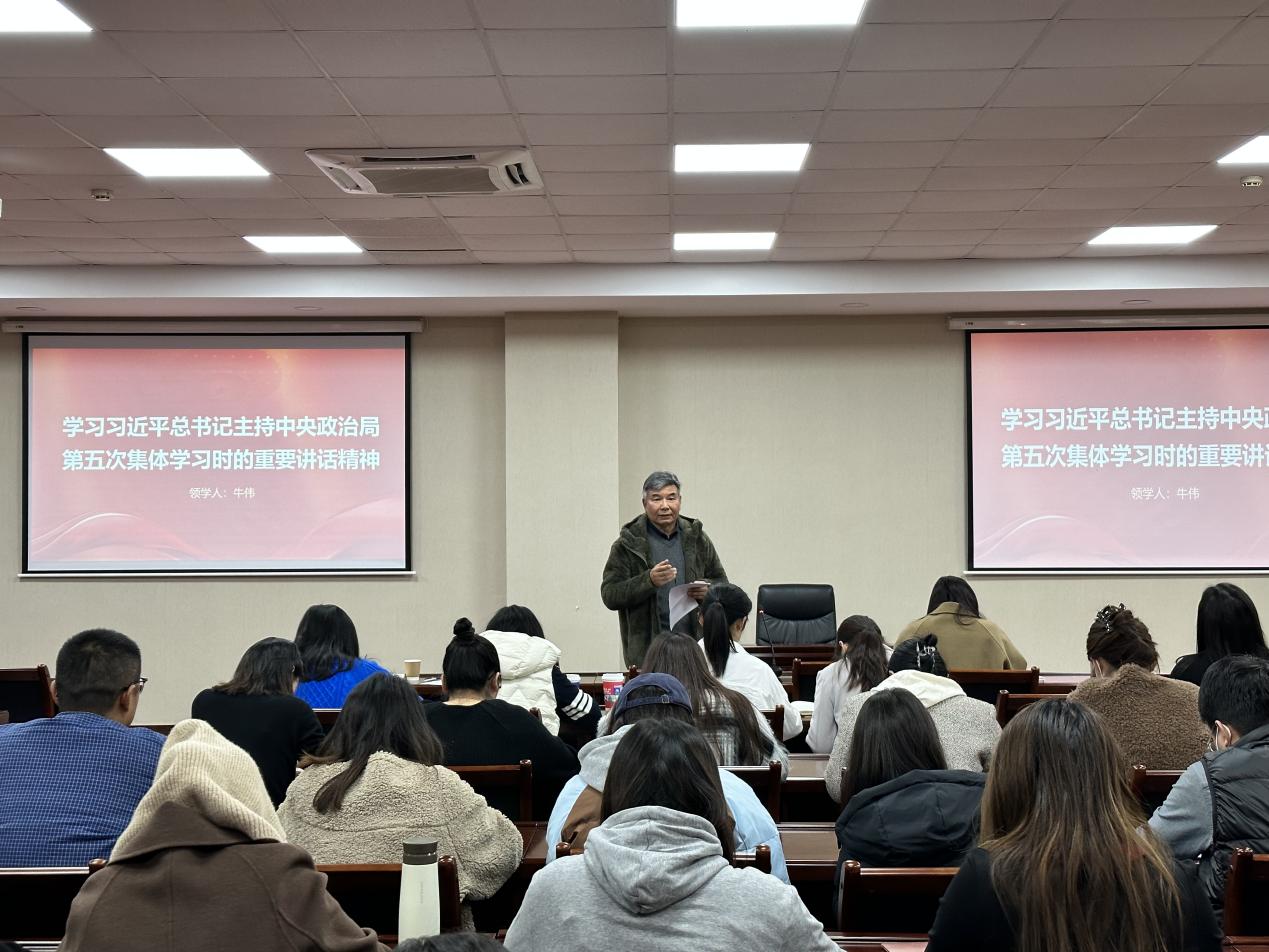 教育兴则国家兴,教育强则国家强。为深入学习领会习近平总书记在中共中央政治局第五次集体学习时的重要讲话精神,增强政治自觉,强化责任担当,提升师德师风工作质量和水平,推进教师队伍建设高质量发展。国际商学院党总支组织全体党员教师于11月22日在215会议室开展了以“学习习近平总书记主持中央政治局第五次集体学习时的重要讲话精神”的专题党课学习。本次党课学习由国际商学院党总支委员牛伟同志主讲,党总支书记王则斌同志主持。