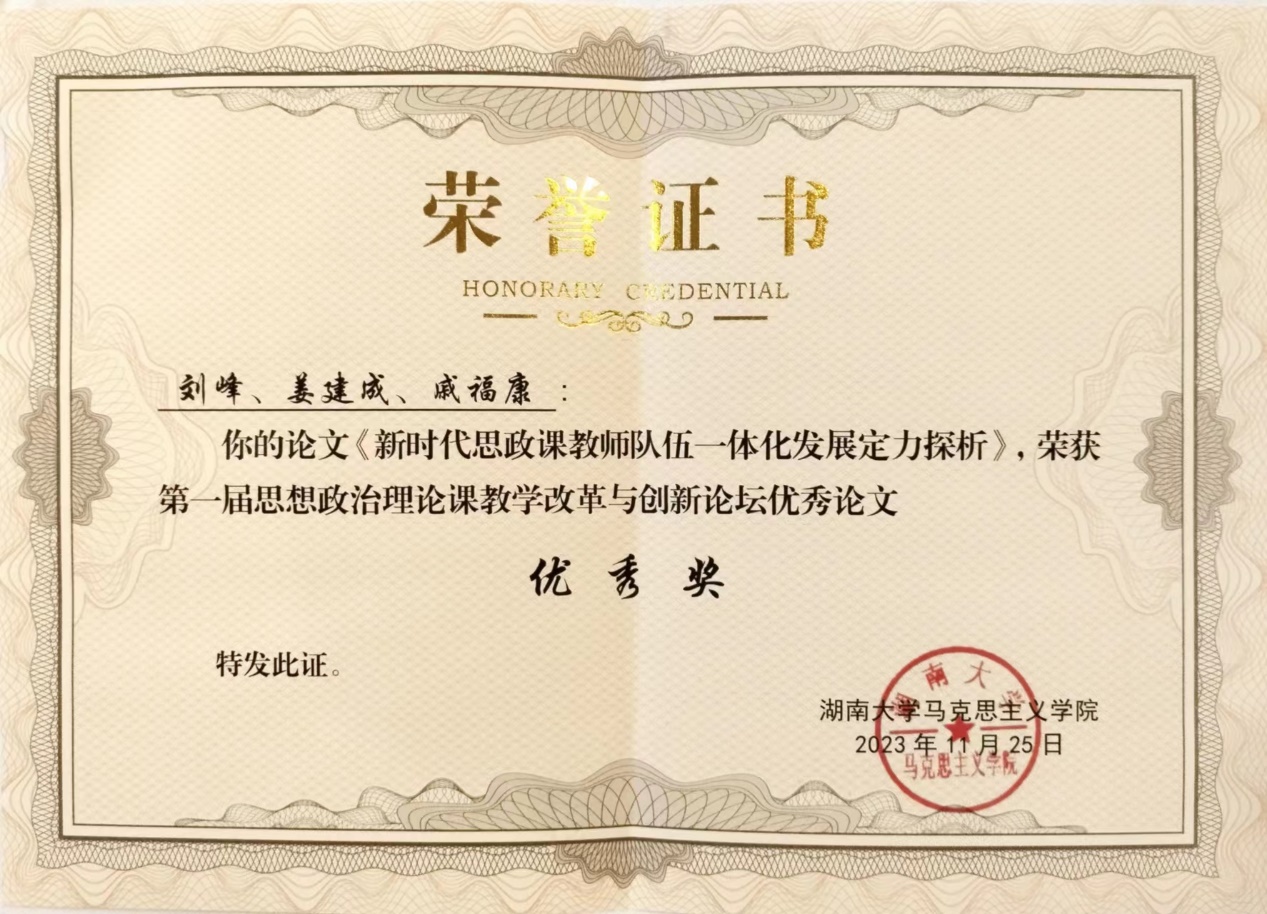 为深入学习贯彻党的二十大精神,深刻把握习近平总书记关于加强和改进高校思想政治教育的重要论述,不断提升高校思想政治理论课教学质量,湖南大学马克思主义学院和北京师范大学思想政治工作研究院于2023年11月24-26日在湖南长沙举办思想政治理论课教学改革与创新论坛。我校马克思主义学院刘峰老师受邀参会,论文《新时代思政课教师队伍一体化发展定力探析》获评为优秀会议论文。