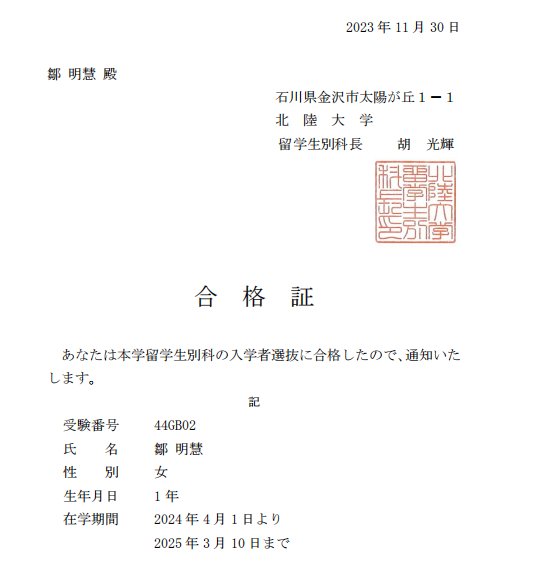 近日,我校接到日本北陆大学下发的录取通知,我校日语专业2021级学生邹明慧、黄代杰经过北陆大学的笔试、面试,顺利被该大学录取。两名学生将于2024年4月赴日本北陆大学留学深造,成为我校首批派往海外高校联合培养的学生。两名学生均是我校日语专业优秀学生,通过不断的练习和实践努力提高自己的语言表达能力,建立了坚实的语言基础,最终凭借自身扎实的知识储备和良好的文化素养顺利考取北陆大学,为我校赢得了荣誉。其中,邹明慧同学此前顺利通过日本语N2能力测试,根据北陆大学奖学金政策,在学期间每年将获得北陆大学颁发的20万日元奖学金(约人民币9,600元)。