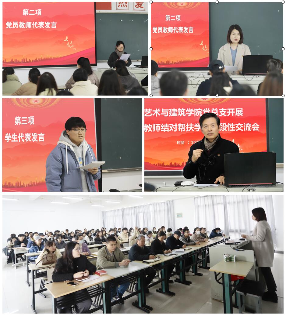 为进一步发挥党员教师的先锋模范作用,帮助学生自强自律,推动主题教育走深走实,11月30日,艺术与建筑学院党总支在12-402教室召开党员教师结对帮扶学生阶段性交流会。党总支书记、副院长施建平教授,党总支副书记纪冰心副教授,纪检委员张斌副院长,宣传委员江水明副院长,组织委员、学工支部书记、学工办主任李一帆老师,艺术与建筑学院全体党员教师,部分受帮扶同学,大一、大二学生代表及入党积极分子参加会议。会议由党总支宣传委员江水明主持。
