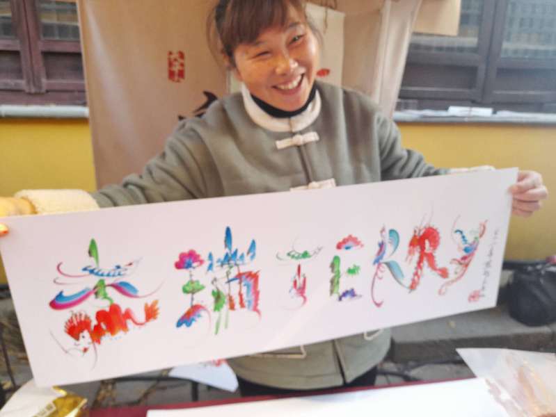 随后,留学生们还游览了山脚下的非物质文化遗产市集,现场有糖画、兔子灯、原木堆画等非遗项目,“花鸟龙凤字”非遗传承人集书法和绘画于一体,将色彩的晕染渐变与巧妙的设计相结合,充分展现非遗之美。