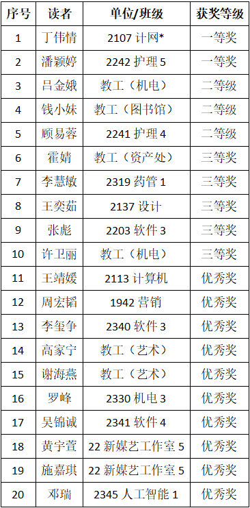 图书馆根据读者借阅量及阅读质量,评选出2023-2024-1学期“阅读之星”共20名。名单如下: