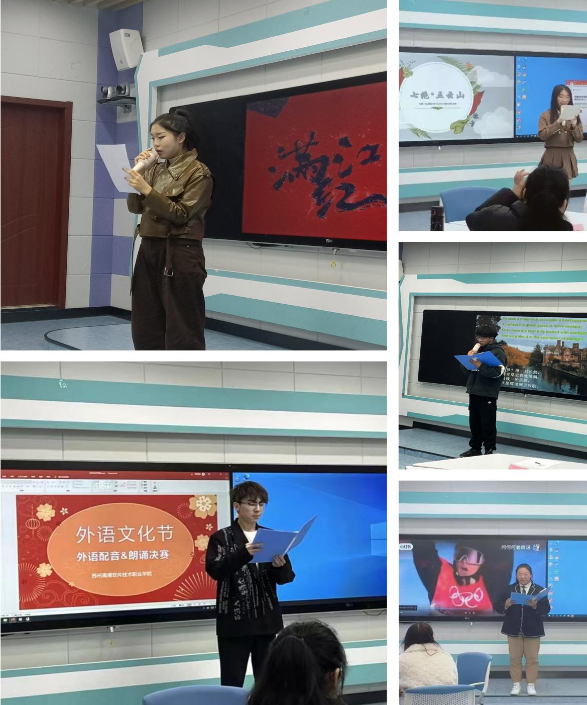 经过初赛的阶段的准备和筛选,来自英语专业、日语专业以及公外共14组选手脱颖而出。12月6日,在学校智慧教室b301成功举办了朗诵和配音比赛的决赛。决赛场上选手们各显身手,节目精彩纷呈。英文朗诵《沁园春・雪》,伴随着背景音乐,饱含深情地歌颂祖国的大好河山;英文诗歌朗诵《我骄傲我是中国人》,吟诵出对祖国的热爱与自豪;日文朗诵《诗经:桃夭》,优美的韵律充分展现了语言之魅力;日语配音《铃芽之旅》情感饱满、语速流畅,表达出青春的热情与活力。获奖选手的精彩表现将会在外语文化节闭幕式上展出。