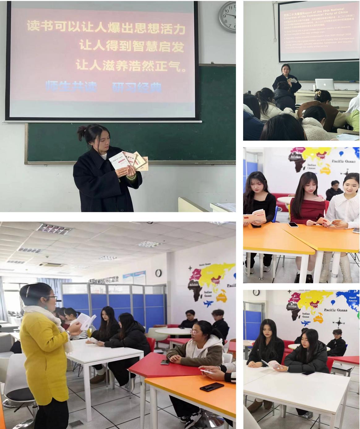外语系党支部制作了《党的二十大报告词条(中英日对照版)》、《习近平新时代中国特色社会主义思想(中英日对照版)》、《以外语之声 传非遗之美 树文化之信》等系列口袋书发放给师生。师生们利用课间、班会等时间在菁菁校园掀起阅读红色书籍、品读红色历史、感悟红色魅力的学习热潮,诵读经典、铭记历史,不忘初心、牢记使命,踔厉奋发、绽放青春。