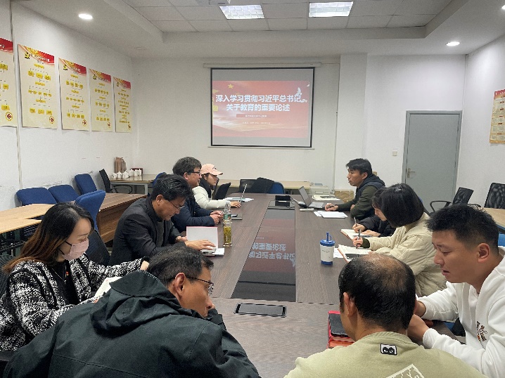 党支部书记张赞上党课,他与大家分享了学习习近平总书记关于教育的重要论述的深刻体会。习近平总书记在黑龙江考察时强调:“年轻一代成为奋力拼搏、振兴中华的一代,实现第二个百年奋斗目标就充满希望。青年学子要树牢科技报国志,刻苦学习钻研,勇攀科学高峰,在推进强国建设、民族复兴伟业中绽放青春光彩”。作为一名党员教师,我们应始终胸怀“国之大者”,接续砥砺奋斗,练就过硬本领,勇攀科学高峰,为实现高水平科技自立自强和建设教育强国、科技强国、人才强国,全面推进中国式现代化作出新的更大贡献。