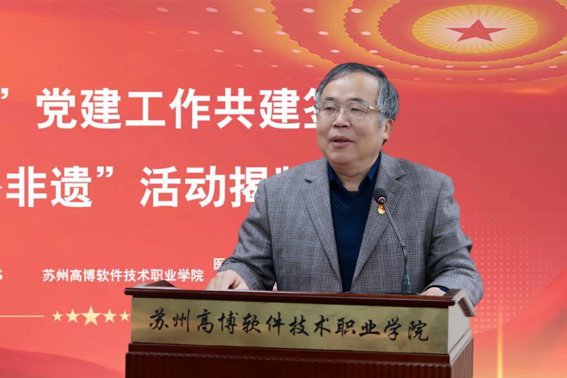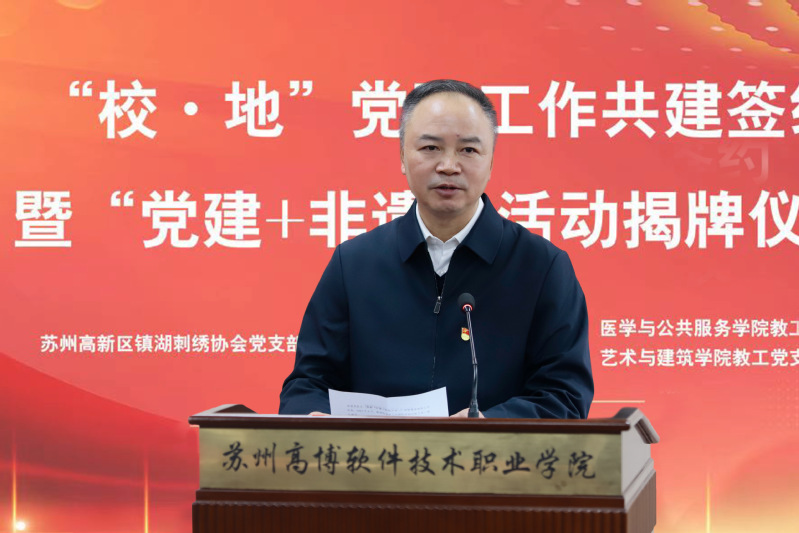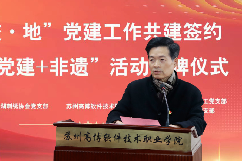 12月15日上午,苏州高新区镇湖刺绣协会党支部、苏州高博软件技术职业学院医学与公共服务学院教工党支部、苏州高博软件技术职业学院艺术与建筑学院教工党支部“校∙地”党建工作共建签约暨“党建+非遗”活动在我校行政楼215报告厅隆重举行。苏州科技城党工委副书记、管委会副主任、镇湖街道党工委书记周经纬,苏绣艺术大师,国务院特殊津贴专家卢福英,镇湖刺绣协会党支部书记张黎星,镇湖刺绣协会秘书长裘星,苏州高博软件技术职业学院党委副书记、副校长徐子良,苏州高博软件技术职业学院艺术与建筑学院党总支书记施建平,苏州高博软件技术职业学院医学与公共服务学院教工党支部书记张婷,苏州高博软件技术职业学院艺术与建筑学院教工党支部书记吴兵等出席本次会议,镇湖刺绣协会成员,党员教师、入党积极分子参加会议,会议由苏州高博软件技术职业学院医学与公共服务学院党总支书记、院长孙小娅主持。