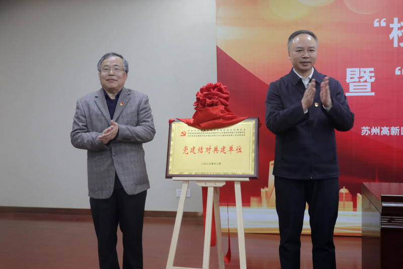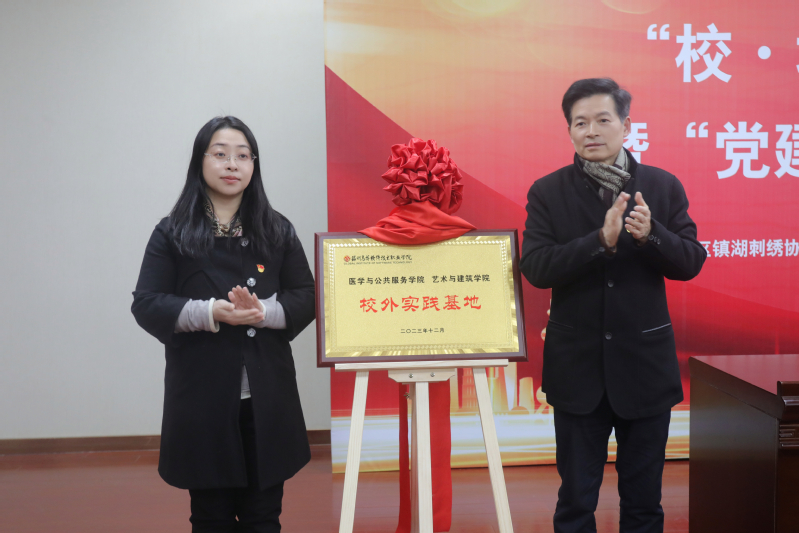 活动现场,镇湖刺绣协会党支部书记张黎星、医学与公共服务学院教工党支部书记张婷、艺术与建筑学院教工党支部书记吴兵代表三方单位签订共建协议书。苏州科技城党工委副书记、管委会副主任、镇湖街道党工委书记周经纬和苏州高博软件技术职业学院副校长徐子良为党建结对共建单位揭牌、苏州镇湖刺绣协会党支部秘书长裘星和艺术与建筑学院党总支部书记施建平为校外实践基地揭牌、镇湖刺绣协会党支部卢福英大师和医学与公共服务学院党总支书记孙小娅为卢福英专家工作室揭牌。