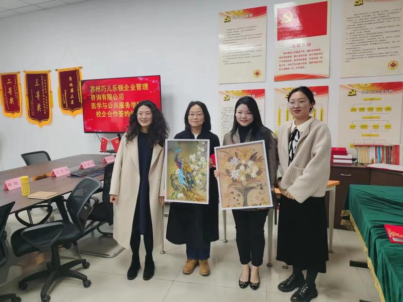 现场,马惜燕园长与孙小娅院长进行了签约,完成了苏州巧儿乐顿有限公司与医学院幼教系共建实习(实践)基地的签约仪式。签约后,幼教系师生向马园长一行赠送了学生美工作品作为纪念。