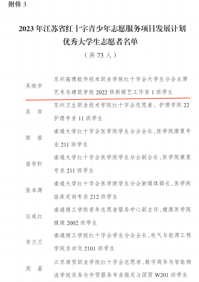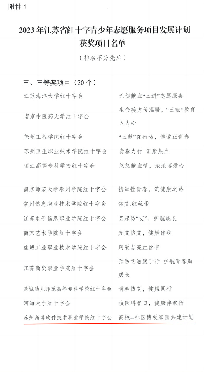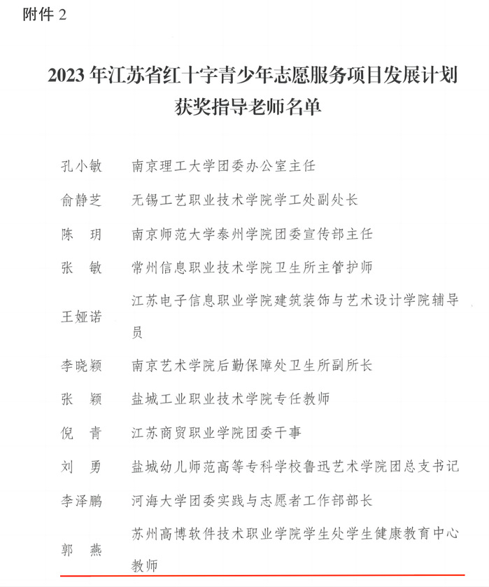 根据江苏省红十字会发布《关于2023年省红十字青少年志愿服务项目发展计划实施情况的通报》(苏红【2023】51号)文件,我校红十字“高校--社区博爱家园共建计划”项目获得三等奖,郭燕老师被评为优秀指导老师,艺术与建筑学院吴晓宇同学被评为优秀大学生志愿者。