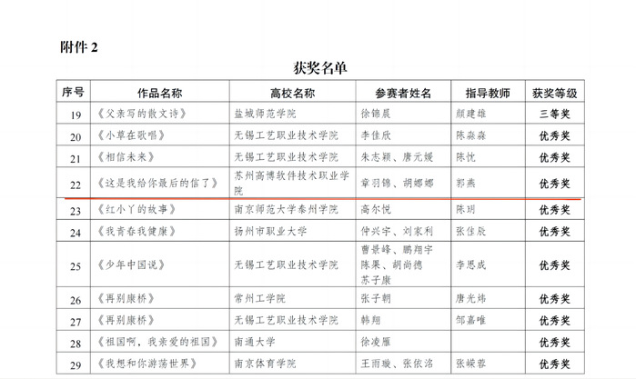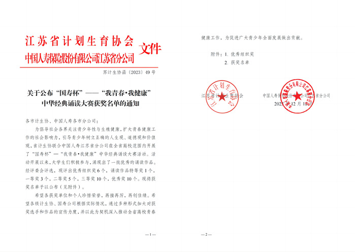 根据江苏省计生协发布《关于公布“国寿杯”——“我青春·我健康”中华经典诵读大赛获奖名单的通知》(苏计生协函【2023】49 号)文件,我校学生健康教育中心推选的诵读作品获得优秀奖。