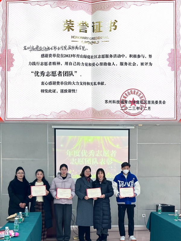 2023年12月26日,青山绿庭社区举办了年度志愿服务表彰大会,苏州高博软件技术职业学院国际商学院被评为“优秀志愿者团队”。