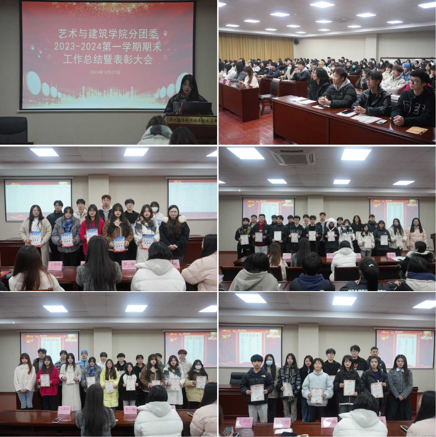 为表彰优秀,鼓励先进,树立典型,充分发挥学生干部的带头作用,12月27日中午12:40,艺术与建筑学院分团委在14-215会议室顺利召开了2023-2024学年第一学期期末工作总结暨表彰大会。参加此次大会的有学生党支部书记、学工办主任李一帆老师,分团委书记韩露老师,辅导员何婷婷、王嘉琦、徐超群老师,以及艺术与建筑学院第七届学生会、艺术团和青年学习社全体成员。大会由陈果果同学主持。