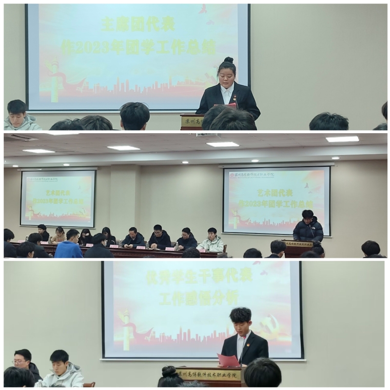 随后,机电学院学生会主席团成员宋雪同学从思想政治引领、组织建设、社会实践、志愿服务、文体活动等方面作了工作总结报告,回顾了过去一年团学组织所取得的成绩,并号召大家在新的一年里凝心聚力,团结合作,共同进步,为学生干部事业添砖加瓦。机电学院大学生艺术团韩成伟同学对艺术团的工作进行了回顾,分析了目前艺术团所取得的成就和所面临的困难,表示在接下来的工作中,一定排练出更多精彩的节目。机电学院青年学习社优秀学生代表王良宇同学分享了加入团学组织的成长收获与感悟,表示在接下来的日子里将再接再厉,继续提升自身能力,为全校师生提供更多优质的服务。