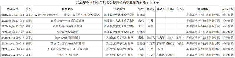 近日,由中央电化教育馆组织开展的2023年全国教师信息素养提升实践活动(第二十七届教师活动)圆满结束。本届活动全国共有1459件作品参加职业教育专项评比,我校遴选出8件作品参评。经省级组织单位评审,学校8件作品均获得殊荣,分别为实践性教学案例标杆作品3件,典型作品1件;数字教材样章标杆作品2件,典型作品2件,获奖名单如下。