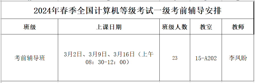 2024年上半年全国计算机等级考试将于3月23日-25日举行,信息与软件学院于3月2日-3月24日开设辅导班,辅导班任课教师为李凤盼(QQ:1370462706)。
