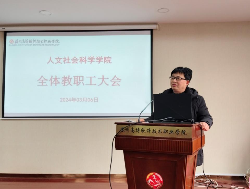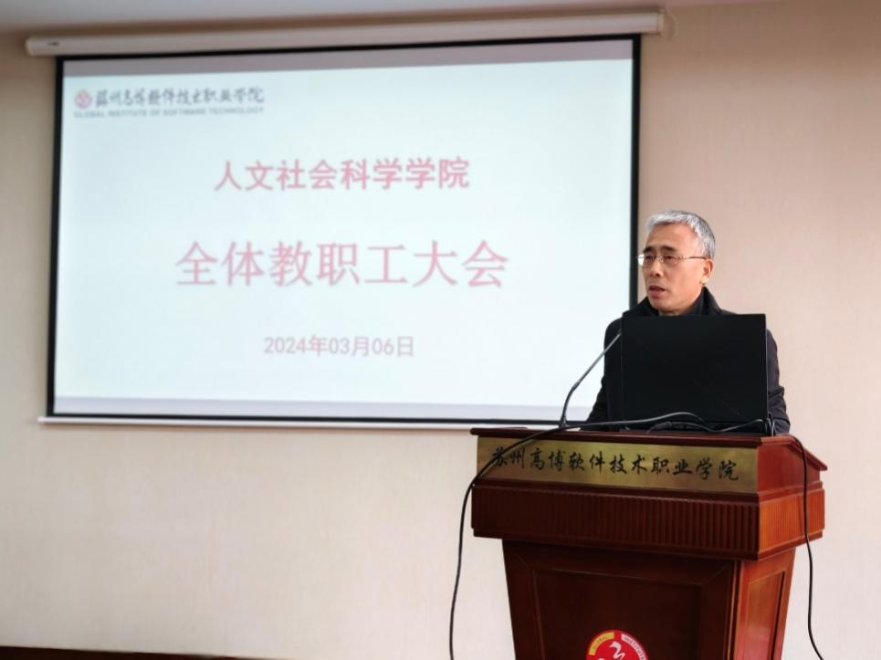 校长助理、学院院长黄兴在充分肯定2023年学院各方面取得成绩的同时,指出了在教学、科研、学生管理与服务以及内部管理等方面存在的不足和问题,并重点从进一步突出教学主体地位,全面提升教学质量、持续推进教师教科研能力提升计划,促进学院科研发展、践行教书育人理念,引导学生成长成才、完善教师工作量考核与绩效奖励办法,激发教职员工工作积极性等方面对全年主要工作做了部署。黄兴希望全院教职员工凝心聚力,振奋精神,鼓足干劲,积极认真投入到全年各项工作中去,高质量完成全年工作任务,为人文学院以及整个高博学院各项事业发展贡献力量。