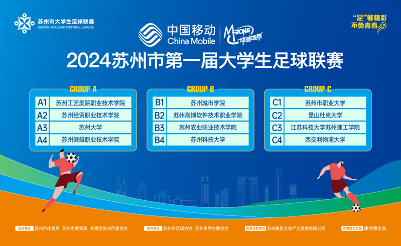 据悉,本届赛事由市体育局、市教育局、苏州团市委共同发起主办,市足协、市学生联合会承办。赛事为11人制,小组赛阶段采取分组双循环,第二阶段实行交叉淘汰。整个赛季均采用主客场制,赛程计划延续至5月中旬,各参赛队伍将以本校作为主场,吸引更多在校大学生关注足球运动,进一步丰富校园文化,提升在苏高校大学生足球运动水平。首届赛事吸引了苏州大学、苏州科技大学、西交利物浦大学、昆山杜克大学、苏州城市学院、江苏科技大学苏州理工学院等6所本科院校,苏州工艺美术职业技术学院、苏州农业职业技术学院、苏州经贸职业技术学院、苏州市职业大学、苏州高博软件技术职业学院、苏州健雄职业技术学院等6所大专院校的296名球员报名参赛。