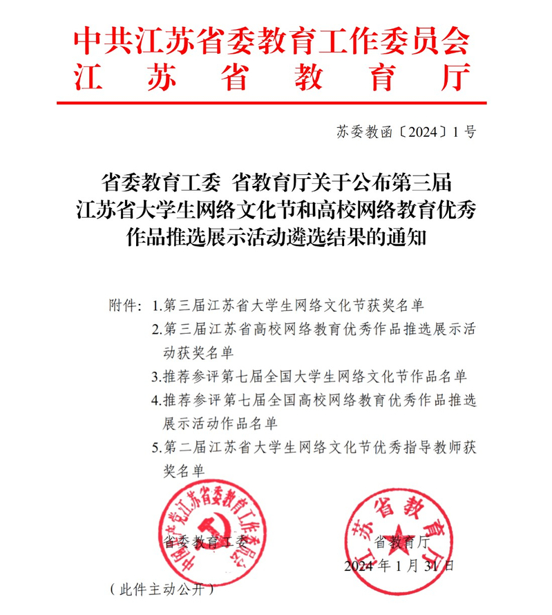 近日,第三届江苏省大学生网络文化节活动获奖名单揭晓。经过高校申报、材料初审、专家评审、拟获奖作品内容审核等,省委教育工委、省教育厅对第三届江苏省大学生网络文化节优秀作品进行展示活动,我校在微视频、动漫、摄影、网文、音频等五项作品征集活动中均有所斩获,共计8件作品获奖,其中二等奖2项,三等奖6项。