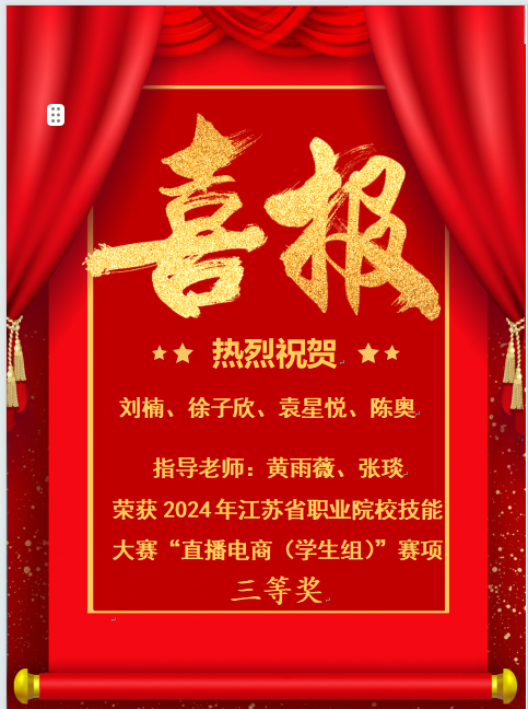3月29日—30日,江苏省职业院校技能大赛高职“直播电商”赛项在江苏省南京信息职业技术学院举行,来自全省13地市51支队伍同台竞技。经过激烈角逐,我校“直播电商”赛项参赛学生刘楠,徐子欣,袁星悦,陈奥四位同学在指导老师黄雨薇、张琰的悉心指导下,斩获团体三等奖的好成绩。
