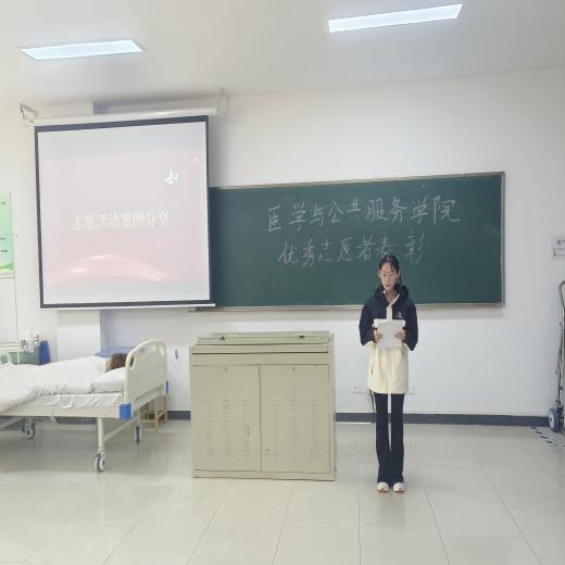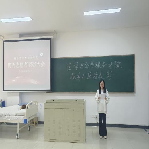 为弘扬志愿者精神,提高志愿者团队的凝聚力和归属感。4月1日,医学与公共服务学院分团委在12-103举行了三月份优秀志愿者表彰大会。盛佳怡同学为本次大会主持人。