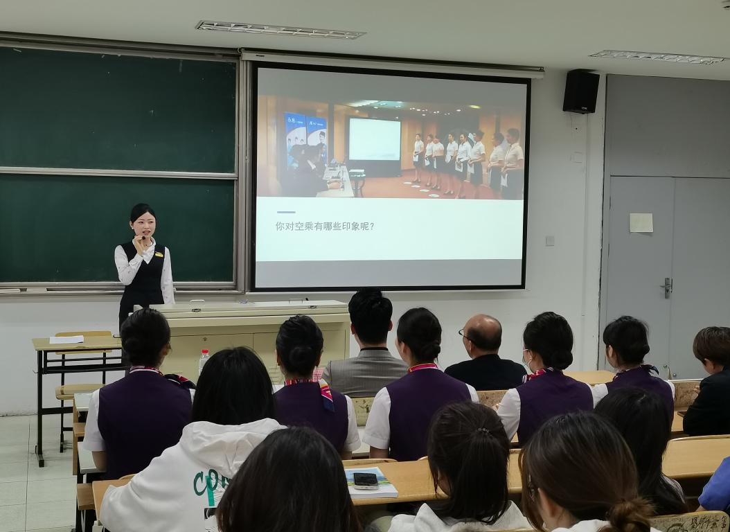 随后,特邀专家深圳航空公司徐佳蕾乘务长为大家讲述了自己的飞行经历及飞行趣事,让在场同学对空乘这个职业有了不同层面的认知和更深刻的了解;她说道:“在飞行的10余年间始终不忘的是坚守初心,希望能在自己的乘务岗位上发光发热,将每位旅客安全的送到目的地。”这份情怀感动到了在场的所有人。初心易守,始终难得,让同学们对相关职业的看法和承载的责任有更深刻的感悟。接着,徐佳蕾乘务长还为同学们科普了空乘专业需要掌握的相关知识技能和从业要求,在场同学积极提问互动,氛围热烈,收获颇丰。