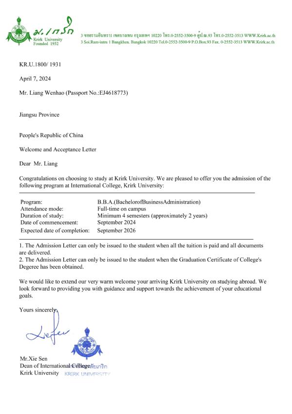 近日,我校国际商学院2022级学生梁纹豪、陈亿初先后收到泰国格乐大学的录取通知书,他们被格乐大学工商管理系录取,将于今年9月前往格乐大学攻读本科课程。这两名学生是经本人申请、我校国际交流合作处推荐、并经过格乐大学组织的心理测试、综合笔试和面试后,最终凭借出色的学业表现和综合素质顺利通过选拔,被格乐大学工商管理系录取的。