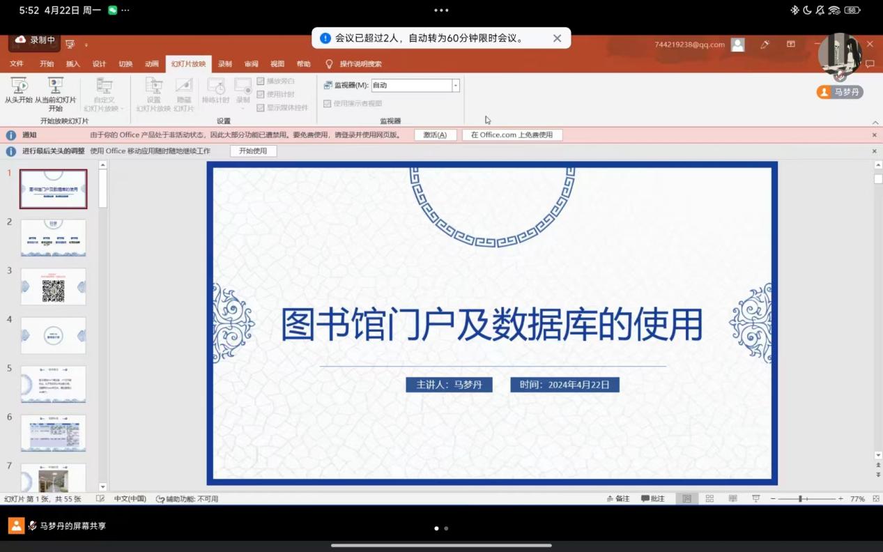 4月22日晚上,图书馆2024年“世界读书日”系列活动之“图书馆门户及数据库的使用”信息素养讲座在腾讯会议举行,由图书馆马梦丹老师主讲。此次讲座活动旨在让广大师生进一步了解图书馆资源、服务项目,提高师生对文献信息的获取、分析和利用能力。