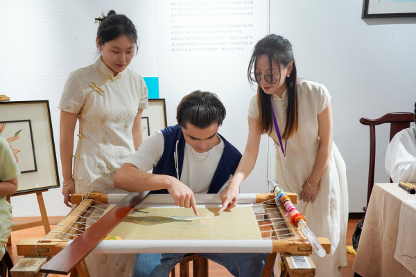 学校与卢福英刺绣文化有限公司等企业深度合作,校企协同育人,将中国非遗文化引入校园、带进课堂,通过开设苏绣、景泰蓝工艺画制作等特色课程,使得更多的学生有机会接触和学习经典传统技艺,有效地促进了非遗文化的传承和发展,同时提升了学生的综合素质和文化自信。苏绣是我国四大名绣之一,以其精致的工艺和雅致的美学特色而闻名,被列入第一批国家级非物质文化遗产名录。景泰蓝制作技艺是我国非物质文化遗产,“景泰蓝工艺画”则是应用传统景泰蓝工艺中的掐丝点蓝核心工序制作而成,是集文化内涵、艺术欣赏、装饰收藏于一体的手工艺术品。
