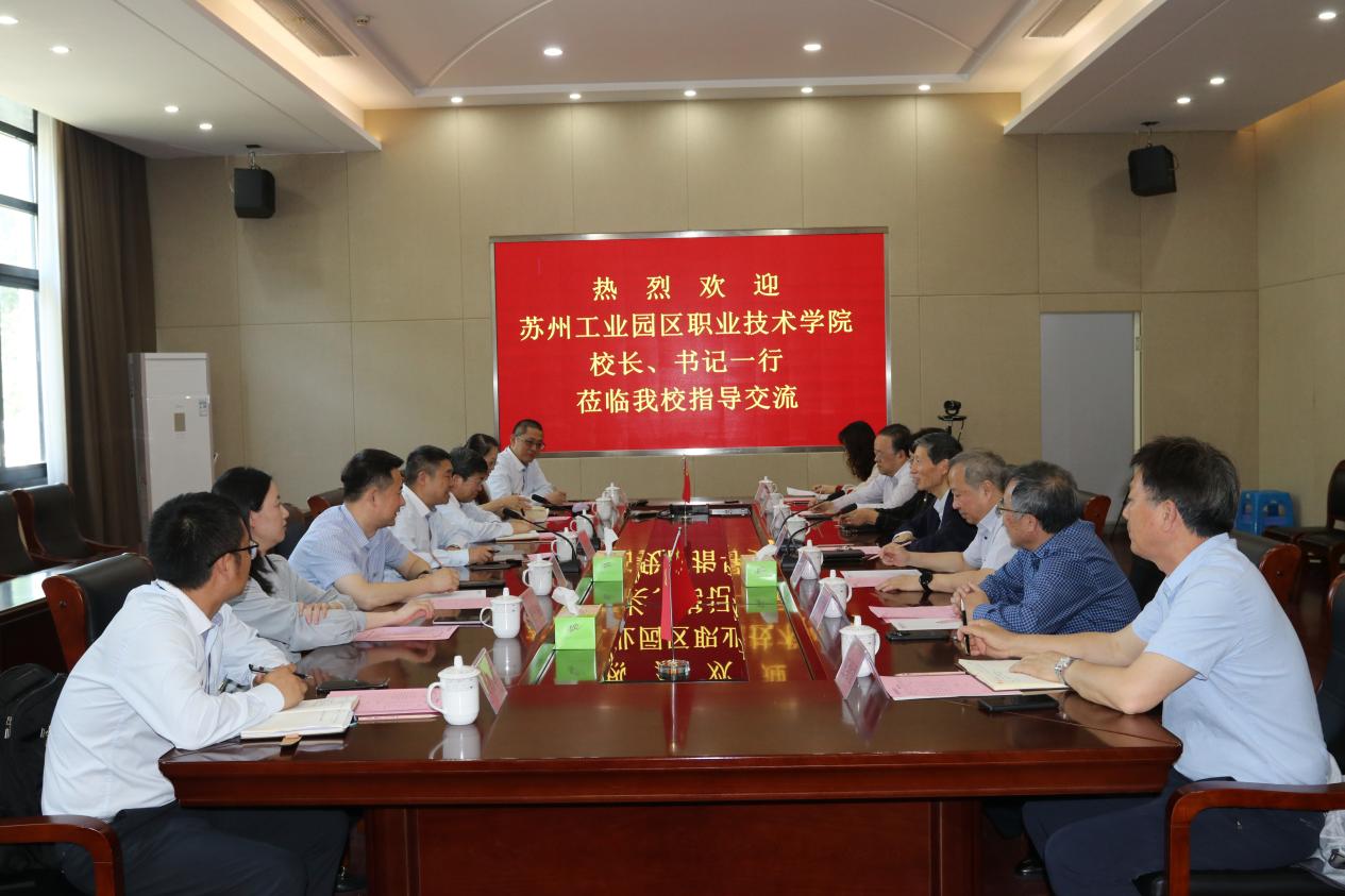 5月28日上午,苏州工业园区职业技术学院校长王应海、书记钮雪林一行7人莅临我校指导交流。学校校长朱秀林,党委书记薛辉,副书记、副校长倪筱琴、徐子良,副校长周肖兴,校办主任王绍福,人事处处长龚三琼、党委工作部部长助理李一帆参加会议。会议由朱秀林校长主持。