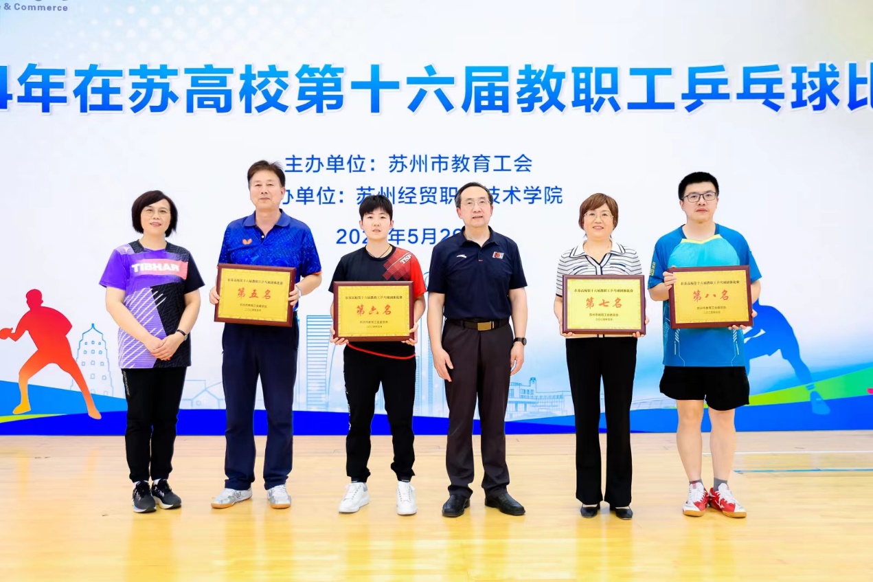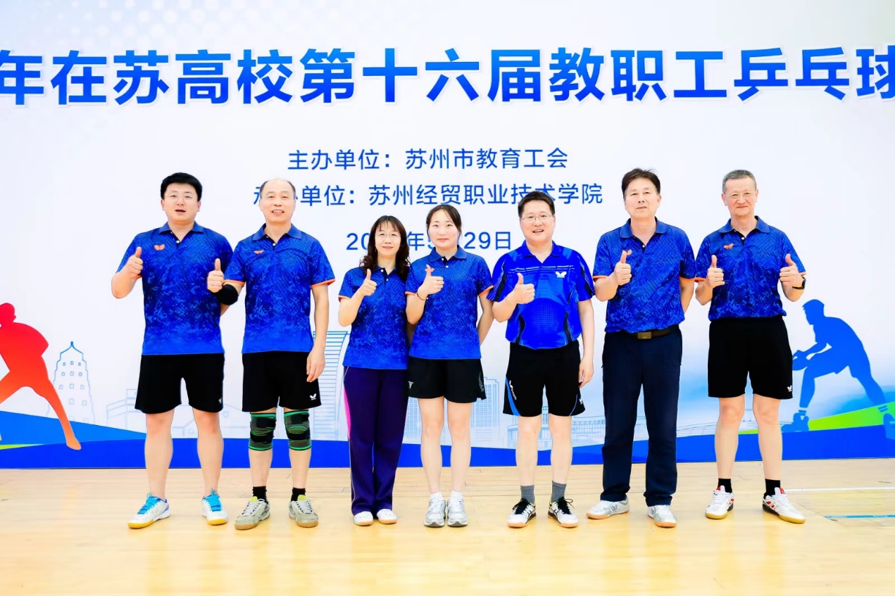 5月29日,由苏州市教育工会主办的在苏高校第十六届教职工乒乓球比赛在苏州经贸职业技术学院火热进行,共有十六支代表队参加比赛。经过全天精彩、激烈地角逐,我校乒乓球队员们团结协作,奋力拼搏,先后战胜了硅湖职业技术学院、苏州经贸职业技术学院和苏州工艺美术职业技术学院等强劲对手,最终荣获团体第五名的好成绩。