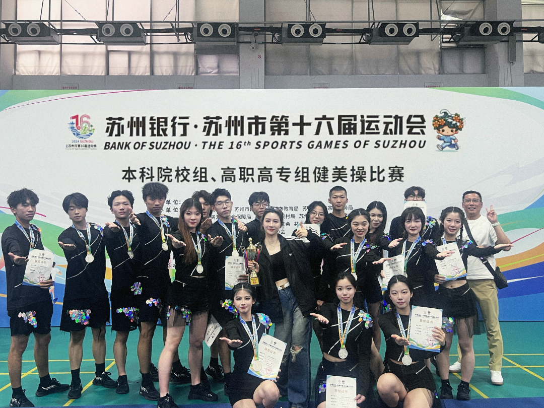 由苏州市人民政府主办,中共苏州市委宣传部、苏州市体育局、苏州市教育局等单位承办,苏州市健身健美运动协会协办的苏州市第十六届运动会本科院校组、高职高专组健美操比赛于6月1日在苏州市职业大学体育馆举行。共有来自全市6所本科院校、10所高职高专院校组队的近300名大学生参加了比赛。我校健美操队在指导教师谢媔媔的带领下,通过规定动作和自选动作两轮比拼,最终凭借精湛的技艺和出色的表现,获得了第二名的好成绩,为学校取得了荣誉。