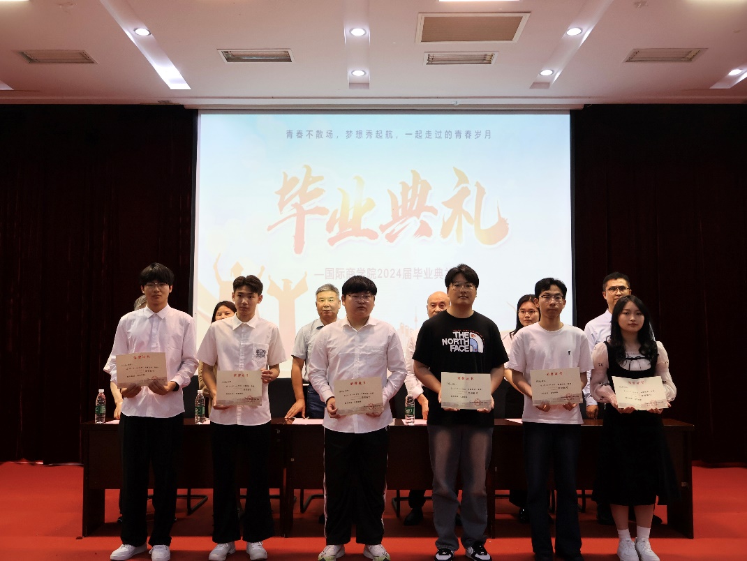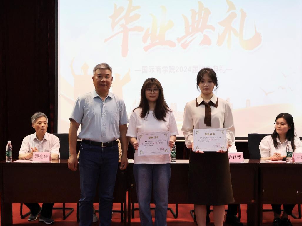 毕业典礼在庄严的国歌声中拉开序幕。为进一步深化产教融合,落实优秀技能人才培养要求,树立优秀典型促进实践教学水平提升,根据《职业学校学生实习管理规定》等文件精神,结合同学们在近一年的实习工作中的表现,国际商学院评选出陈秦霞等6名优秀实习学生。由学院党总支书记王则斌教授为优秀实习生代表颁发荣誉证书。