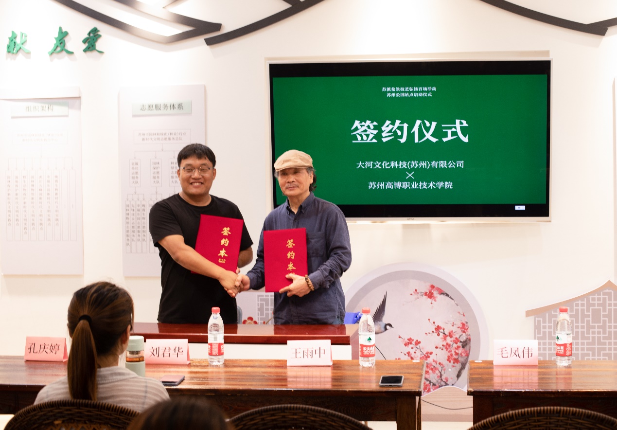 毛凤伟总经理与王雨中院长签订校企合作协议,大河文化科技向艺术学院授“苏小鹊慈善公益高博志愿者爱心服务站”牌,艺术学院向大河文化科技授“苏州高博职业学院大学生社会实践与创业研学基地”牌,拉开双方真诚合作序幕。王雨中院长代表艺术学院在致辞中感谢大河文化科技的信任。双方以苏小鹊慈善公益高博志愿者爱心服务站培养大学生的社会责任感和实践能力为合作起点,利用专业优势,通过艺术构思与技术的结合,展开苏派盆景艺术课程开发研究等合作,期待双方在盆景艺术的传承、传播和创新方面取得丰硕成果。