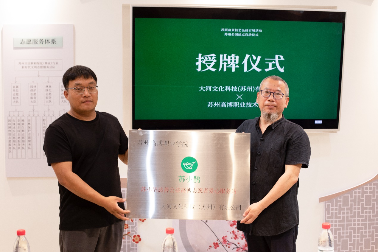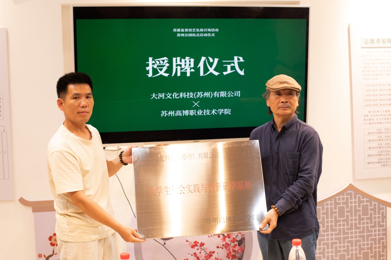 6 月 13 日,苏派盆景技艺弘扬百场活动苏州公园站点正式启动。苏州高博职业学院艺术与建筑学院院长王雨中教授,副院长张斌、孔庆婷应邀参加活动。启动仪式上,艺术与建筑学院与大河文化科技(苏州)有限公司签订合作协议并授牌。艺术学院十名学生志愿者现场体验苏派盆景技艺活动。苏州市园林和绿化(林业)行业新时代文明实践分中心办公室负责人刘君华,苏州相城区女企业家协会副会长、新区侨商会副会长王巍等多位嘉宾莅临活动现场。