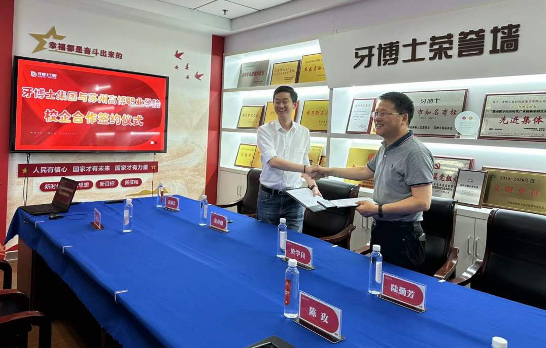 近日,苏州高博职业学院医学与公共服务学院健康管理专业一行深入牙博士集团,就学生实习情况进行了全面考察,并成功签署了校企合作协议。同时,双方还就党建工作进行了深入交流,旨在通过党建引领,促进校企双方在教学、科研、实习就业等方面的深度合作。
