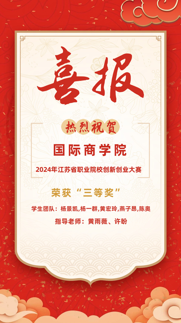 近日,2024年江苏省职业院校创新创业大赛的成绩揭晓,国际商学院黄雨薇、许盼2位老师指导的学生作品《智芯智行--双基电动车识别分析系统》在创意组中荣获三等奖。本次比赛全省共148所院校推荐了参赛作品,经专家在线评审和会议复核,共评审出获奖作品749项,分为了实践启蒙组、创新启蒙组、创业组、创意组,其中创意组一等奖作品54项、二等奖作品108项、三等奖作品165项。