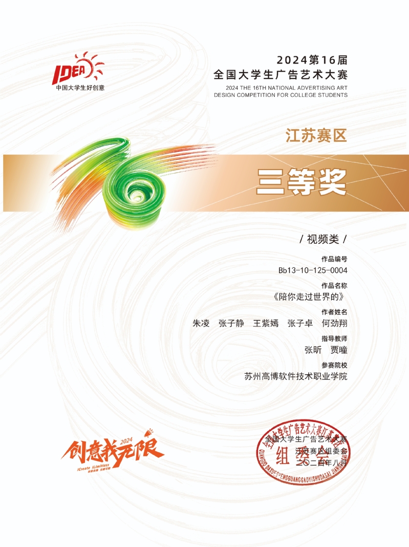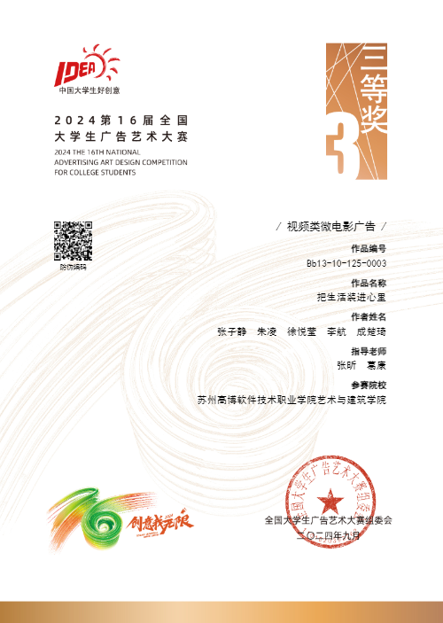在近日揭晓的“创意我无限”第16届全国大学生广告艺术大赛中,苏州高博职业学院艺术与建筑学院师生经过4个月的努力,凭借独特的创意构思、深刻的主题挖掘和精湛的艺术表现力,从众多参赛作品中脱颖而出,其中张子静、朱凌、徐悦莹、李航、成楚琦创作的,张昕、葛康老师共同指导的学生作品《把生活装进心里》获江苏赛区视频类一等奖、全国视频类三等奖,朱凌、张子静、王紫嫣、张子卓、何劲翔创作的,张昕、贾曈老师共同指导的学生作品《陪你走过的世界》获江苏赛区视频类三等奖、全国视频类三等奖。