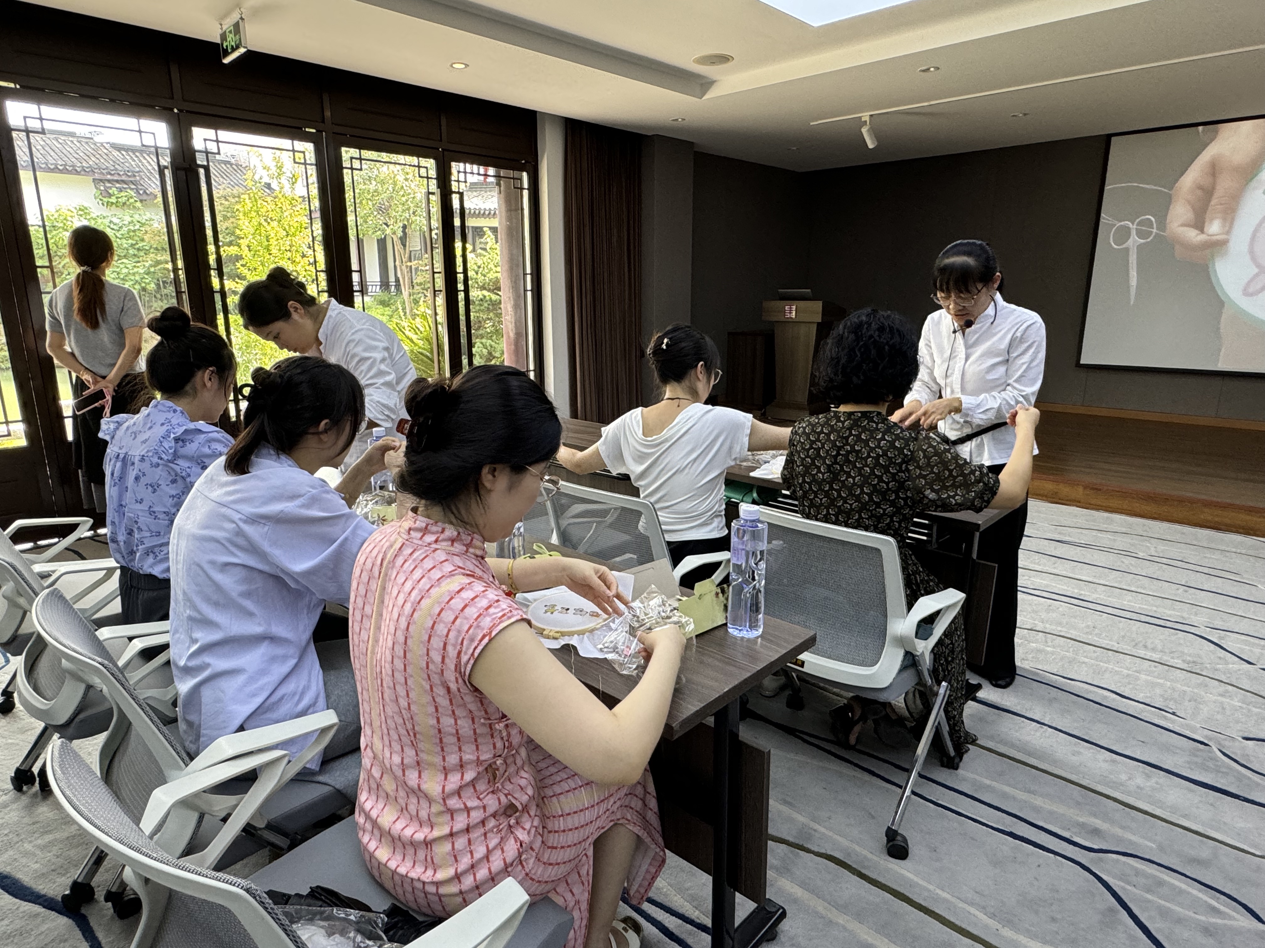 体验苏绣技艺,坚定文化自信。在各位绣工精湛的老师的指导下,大家来到多功能厅,沉浸式体验苏绣制作过程。他们以针为笔,以线为色,在欢声笑语中,努力、认真地绣制属于自己独一无二的苏绣作品,把属于高博人的匠心缝入了团扇的针脚之中。