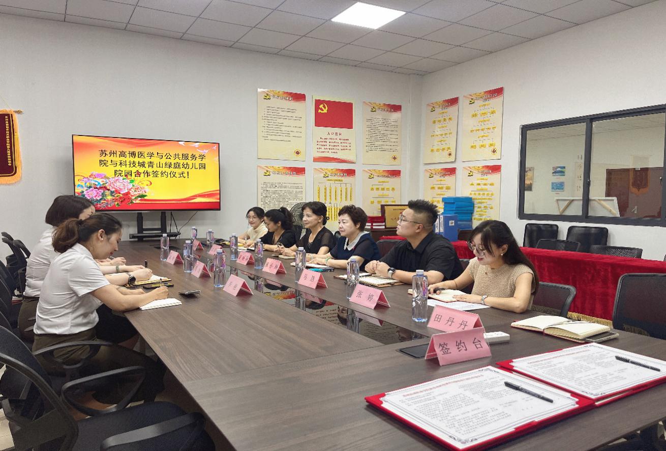 9月19日上午10点苏州高博职业学院医学与公共服务学院幼儿教育系与苏州科技城青山绿庭幼儿园在学院会议室举行校-园合作签约及揭牌仪式。苏州科技城青山绿庭幼儿园园长周洁、副园长黄玲、副园长李艳,苏州高博职业学院校长特别助理、医学院名誉院长薛小玲、校发展办主任马浩、医学院副院长章晓莉、医学院幼教系系主任张婷、幼教系实践教学管理办公室主任沈素嫣、幼教系艺术教研室主任田丹丹、幼教系学前教育专业负责人刘若诗出席活动。会议由幼教系系主任张婷主持。