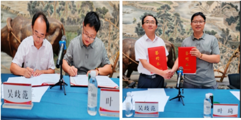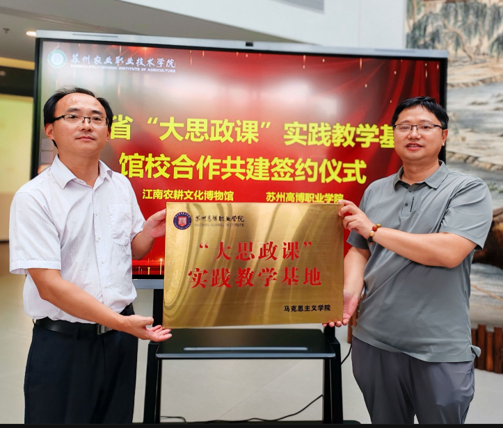 仪式上,叶琦首先向大家介绍了农耕文化博物馆的基本情况。农耕文化博物馆由苏州农业职业技术学院主办的农业主题博物馆,重点展示了太湖流域农耕历史文化发展脉络和稻麦、蚕桑、园艺等特色农耕技艺,弘扬中华农耕文明的精神内核和时代价值。此馆不仅服务教学和科研,还开展了农事体验劳动教育和农耕文化研学实践,既有注重科普教育的博物馆研学,又涵盖农事劳动与科普相结合的劳动研学,让学生在实践中获得新知识、感知新世界。随后,叶院长与吴院长共同签署合作共建协议,吴院长代表学院向江南农耕文化博物馆“大思政课”实践教学基地授牌。