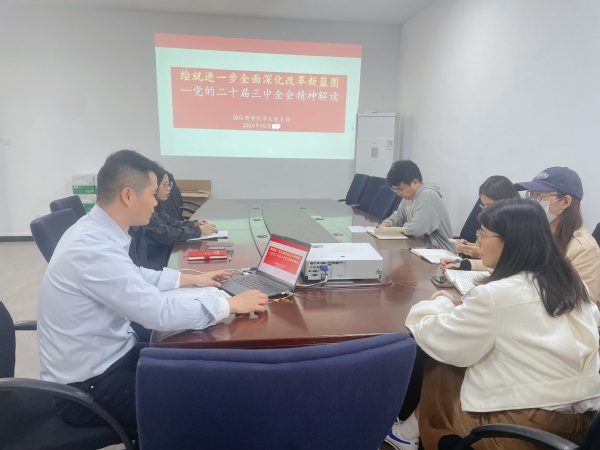 为深入学习贯彻党的二十届三中全会精神,进一步领会全面深化改革的精神实质,国际商学院学生党支部于2024年10月9日深入开展理论学习会,旨在通过集中学习和深入交流党的二十届三中全会精神,提高党员同志的思想认识,凝聚共识。