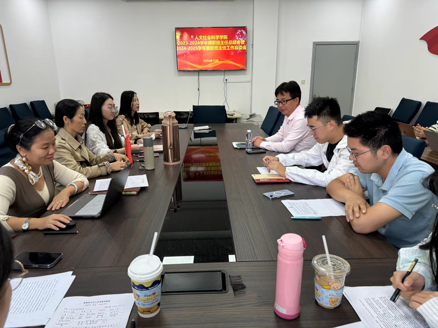 10月9日,人文社会科学学院在14-234召开了“2023-2024学年兼职班主任总结会议暨2024-2025学年兼职班主任启动会”。此次会议旨在总结过去一学年兼职班主任工作的经验与成果,明确新学年的工作职责与方向,进一步加强学院教风学风建设,为学院学生工作的持续发展注入新的动力。