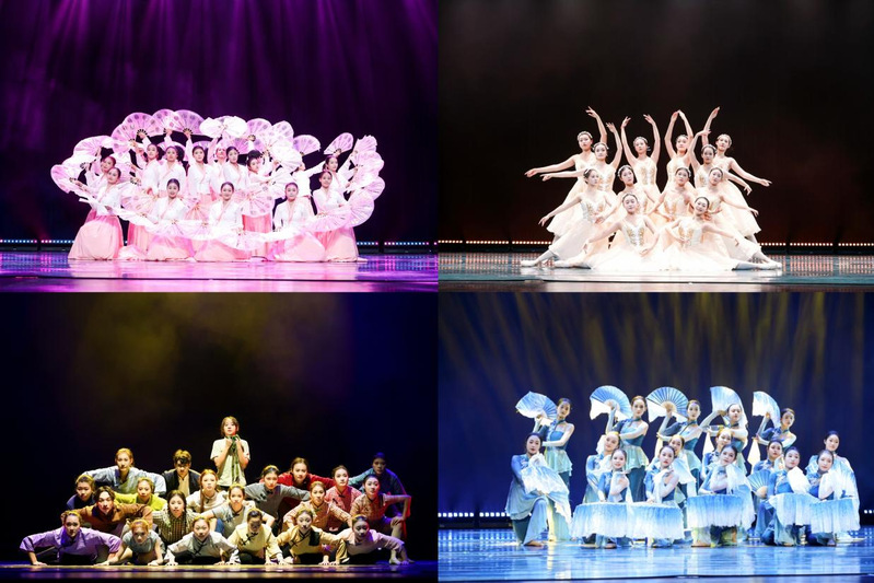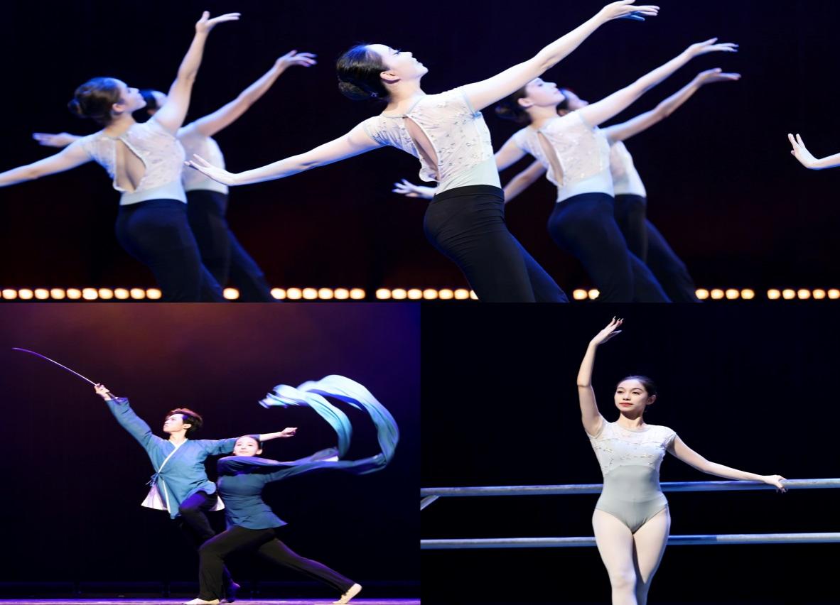 本次汇报演出分课堂汇报和剧目展示两部分。其中,课堂汇报部分反映了同学们在舞蹈课堂学习和训练的场景。芭蕾把杆基训、古典舞《摇臂组合》、《剑袖技术技巧组合》以及蒙古族《筷子》、朝鲜族《双扇》、维吾尔族《顶碗》、江南民间舞《连厢》、海洋秧歌《生命的河》等民间舞组合,同学们用娴熟的舞蹈技艺和丰富的表演能力展示了通过两年学习所掌握的扎实舞蹈基本功,让现场观众切身感受了一场沉浸式舞蹈课。