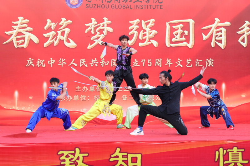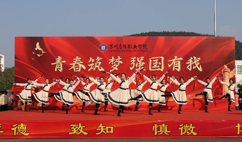 活力四射的开场舞《快乐出发》瞬间点燃了全场的热情,同学们用欢快的舞姿展现着青春的活力与激情,文艺汇演正式拉开序幕。在这个伟大的新时代,高博学子用精彩纷呈的歌舞、情景剧、诗朗诵等节目表达心中拳拳爱国之心,祝福祖国繁荣昌盛。民族舞《美丽中国》以欢快的节奏和生动的表演,体现了中华民族团结一心、共同奋斗的精神风貌,表达出人民群众对美好生活的歌颂和对祖国的深厚情感。退役复学学生代表带来的格斗表演《铁血军魂》写了“召之即来,来之能战,战之必胜”的中国军魂,展现了高博精神塑造的责任担当和青年血性碰撞的中国力量。歌伴舞《国家》以雄厚的歌声和优美的舞姿诉说他们的爱国、爱党情怀。情景剧《百年风华》给观众上了一堂生动的文艺党课,用一幕幕画面、一句句台词再次重温伟大祖国从硝烟弥漫的革命年代一路走向复兴富强的历史征程。歌伴舞《少年》诠释了高博青年坚定自我,勇敢面对千难万险的追梦信念。由新生辅导员代表和24级新生代表带来的朗诵《青春告白祖国》号召当代青年要自觉担当重任,让青春在实现中华民族伟大复兴的中国梦中绽放光彩。古典舞《清风徐来》团扇微动,巧笑轻音,精彩演绎传达出学子们积极向上的蓬勃力量。歌曲串烧《唱支山歌给党听》《天地龙鳞》《梦的光点》《追梦赤子心》《我爱你中国》更是征服全场,唱出高博学子满怀爱国激情,不断追逐梦想的心声。现代舞《舞动青春》展现了青春校园的活力四射、绚烂多姿。武术表演《中华武魂》以其雄浑壮观、震撼心魄的中国功夫将汇演氛围推向了高潮,演绎出了刚强威武、自强不息的中华民族精神。民族舞《欢歌》舞姿优美,欢快流畅,用青春和活泼展现了高博学子热爱祖国热爱生活积极向上的精神面貌。
