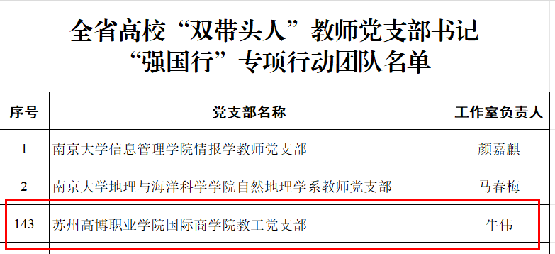 近日,省委教育工委组织处公布《全省高校“双带头人”教师党支部书记“强国行”专项行动团队》名单,我校国际商学院教工党支部成功入选。