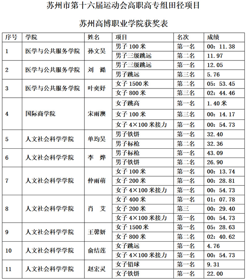 由苏州市人民政府主办的苏州市第十六届运动会本科院校组、高职高专组田径比赛10月24日-25日在苏州大学东校区举行。其中,高职高专组比赛共有来自苏州市职业大学、苏州经贸职业技术学院、苏州工业园区职业技术学院、苏州农业职业技术学院、苏州高博职业学院等十三所院校的250多名运动员参加。我校田径队在此次比赛中表现卓越,获得了13枚金牌、5枚银牌和4枚铜牌的优异成绩,团体总分在全部高职高专院校中位列第一。