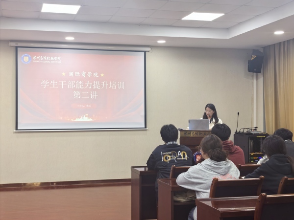 为进一步加强学院学生干部队伍建设,提高学生干部组织管理、沟通协调、团队协作能力,10月31日,国际商学院开展了学生干部专题培训第二课,学院分团委书记姚瑶担任主讲人,以“初心如炬,笃学精技”为主题,就学生干部技能提升进行培训交流。