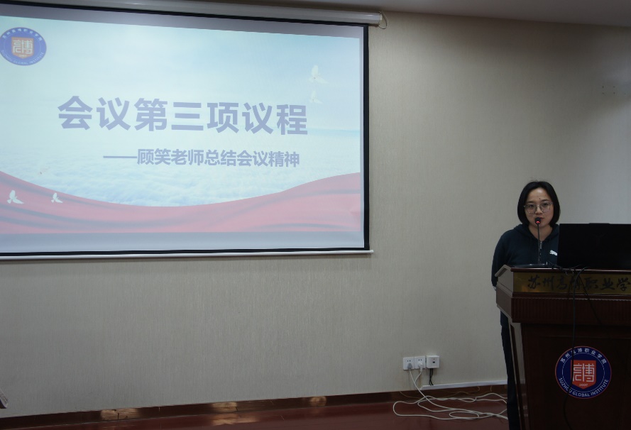 会议的最后,学工办主任顾笑老师对会议要点进行了总结。顾老师充分肯定了学生会过去一年的工作成果,并对未来的工作提出了更高的期望。她强调,团队合作是学生会工作顺利开展的关键,希望全体成员能够团结一心,协作无畏,共同攻克难关,为学院争光添彩。同时,顾老师也鼓励同学们要保持青春激情,书写属于自己的辉煌篇章。