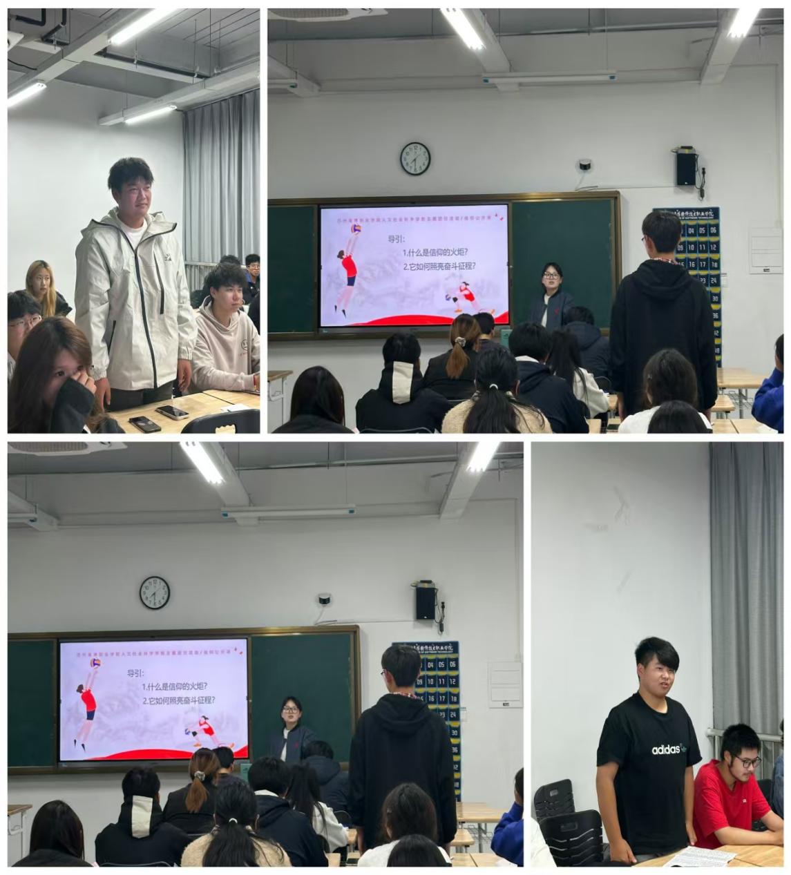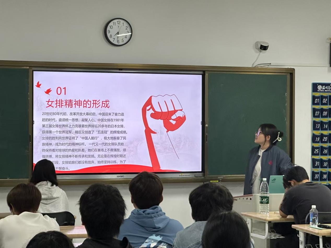 主讲人邹洋洋同学对女排精神的内涵进行了深入剖析,着重强调女排精神绝非仅仅是体育竞技中的拼搏精神,更是一种信仰的强大力量。这种信仰,是对胜利的执着追寻,是于困境中永不言败的坚定信念,亦是团队协作、无私奉献的精神体现。“自信人生二百年,会当水击三千里。” 女排姑娘们凭借着这样的自信与豪情,在赛场上披荆斩棘。